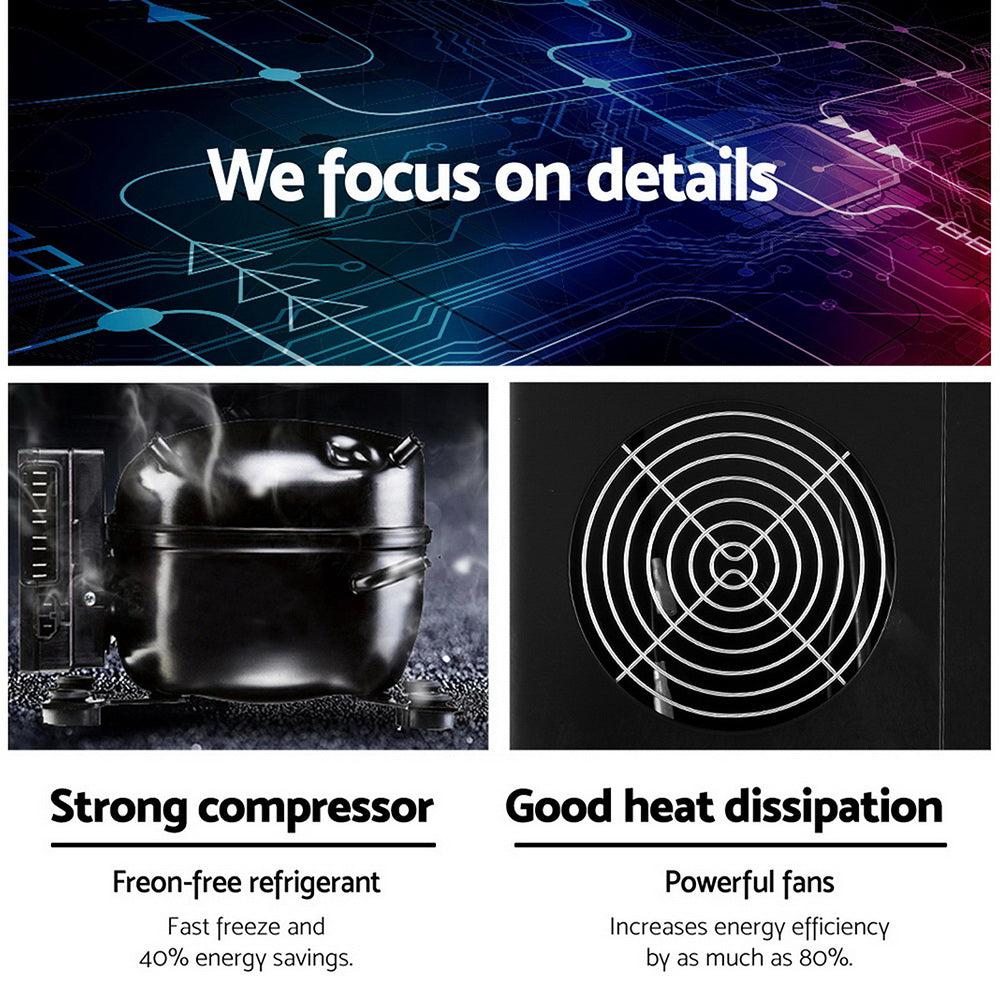 Freon-free refrigerant and enhanced heat dissipation enable low energy consumption