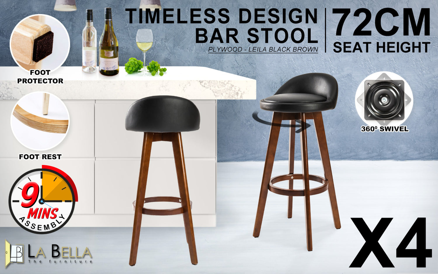 La Bella 4 Set Wooden Bar Stool 72cm Leila Leather Dining Chairs Kitchen - Black Brown