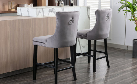 2X Velvet Bar Stools with Studs Trim Wooden Legs Tufted Dining Chairs Kitchen