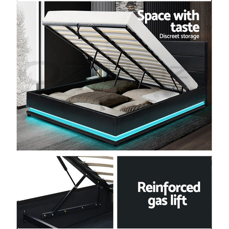 Artiss Lumi LED Bed Frame PU Leather Gas Lift Storage - Black Queen