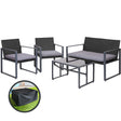 Meticulously crafted, our Gardeon 4-piece Rattan Outdoor Set comprises two armchairs, a two-seater and a matching table for a beautiful integrated look. Its presence will definitely add panache and style to your deck, patio or even living room. Made of eco-friendly PE wicker and a sturdy steel frame, this set is designed to last through all weather and the test of time. The 5mm thick tempered glass top with non-slip suction pads for the table also ensures strong and safe use with total peace of mind. Not least, the cushion covers are removable and washable to maintain their pristine appearance. There is even a bonus storage cover included for you to protect the set from sun and rain when not in use, so that you can keep enjoying your garden parties for many years to come.