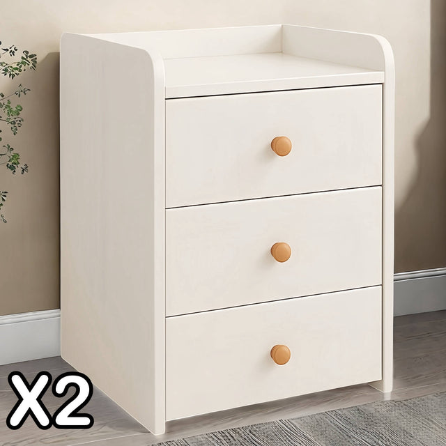2x Bedside Table Pair White 3 Drawers Wooden Knobs Modern Minimalist Design