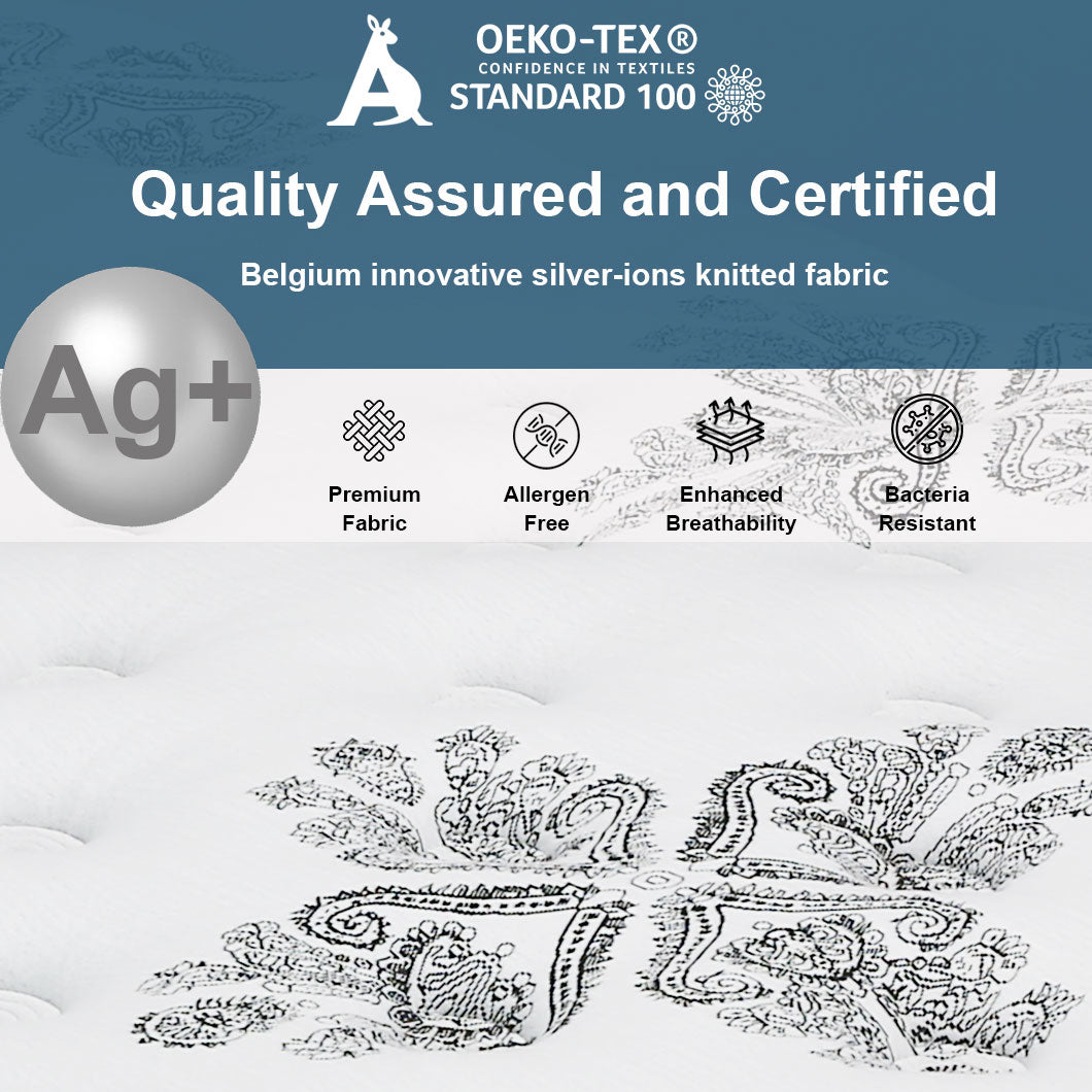 This premium fabric combines the natural softness of organic cotton with the antibacterial power of silver ions, ensuring a clean, breathable sleep environment. The elegant jacquard knit enhances breathability, helping regulate temperature and keep you comfortable throughout the night. Adaptable to your body’s movements, it provides a personalized sleep experience, offering both comfort and durability.