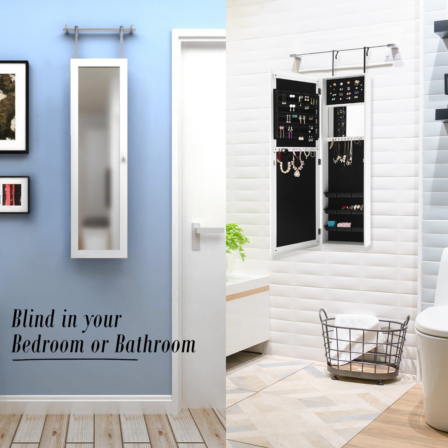 - Space saving - can be hooked on the door or wall mounted