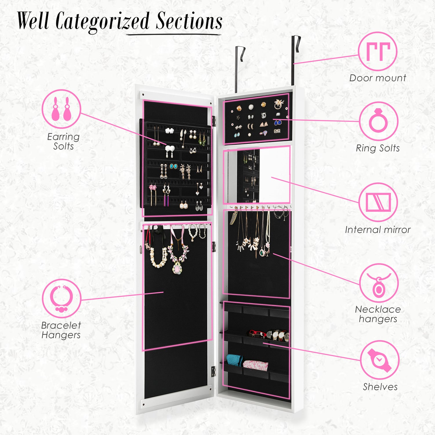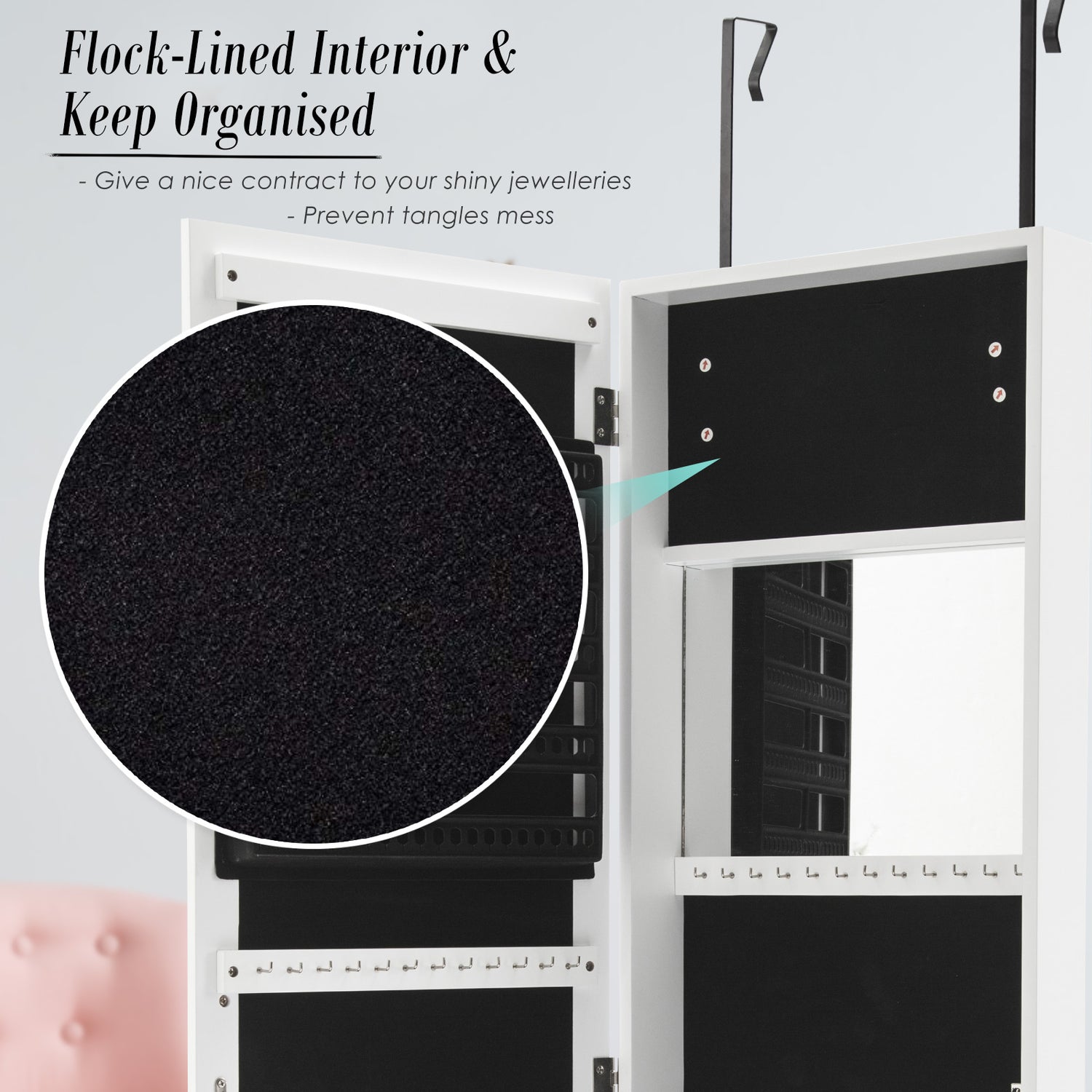 There are many earring hangers, necklace hooks, ring slots, and shelves to make it easier to separate and organise your precious jewelleries. You can certainly find many ways to arrange your accessories so you will be able to find a perfect way only for yourself! The black flock-lined interior will give your shiny jewelleries a nice contrast and under light, it will look even better!